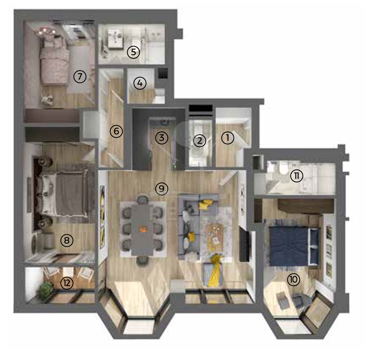 Die Wohnung verfügt über 3 Schlafzimmer und 2 Badezimmer, die als Rückzugsorte und Orte der Erholung dienen. Hier können Sie zur Ruhe kommen und neue Energie tanken.