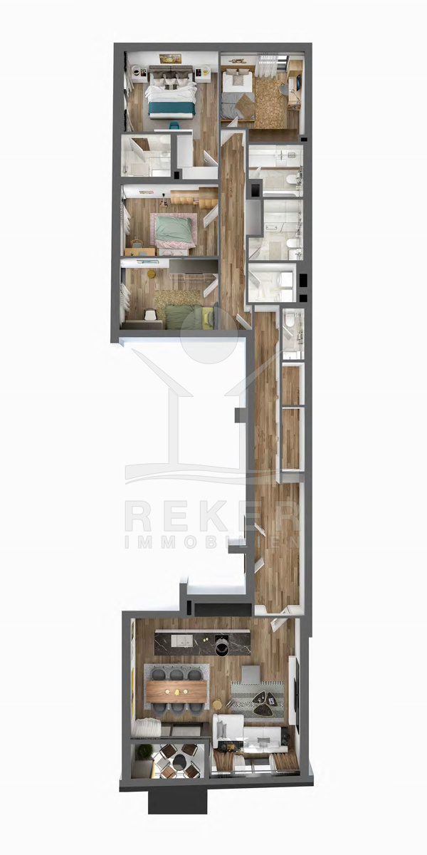 Die geräumige 143 m² Wohnung wird mit einer Klimaanlage und Fußbodenheizung ausgestattet, um ganzjährig angenehme Temperaturen zu gewährleisten. Eine effizient betriebene Luft/Wasser-Wärmepumpe sorgt zudem für eine moderne und umweltfreundliche Heizung. Der großzügige Grundriss umfasst ein offenes Wohnkonzept mit integriertem Ess- und Küchenbereich, ideal für Wohnen auf höchstem Niveau. Mit vier Schlafzimmern, drei Badezimmern, einem Gäste-WC und einem Hauswirtschaftsraum bietet diese Wohnung ausreichend Komfort und Platz für die ganze Familie. Die einladende Loggia lädt zu entspannten Stunden im Freien ein und erweitert den Wohnbereich nach draußen, ideal für gemütliche Abende und entspannte Momente.