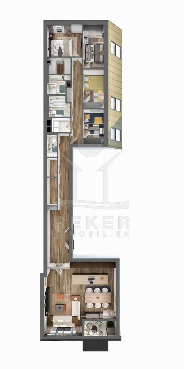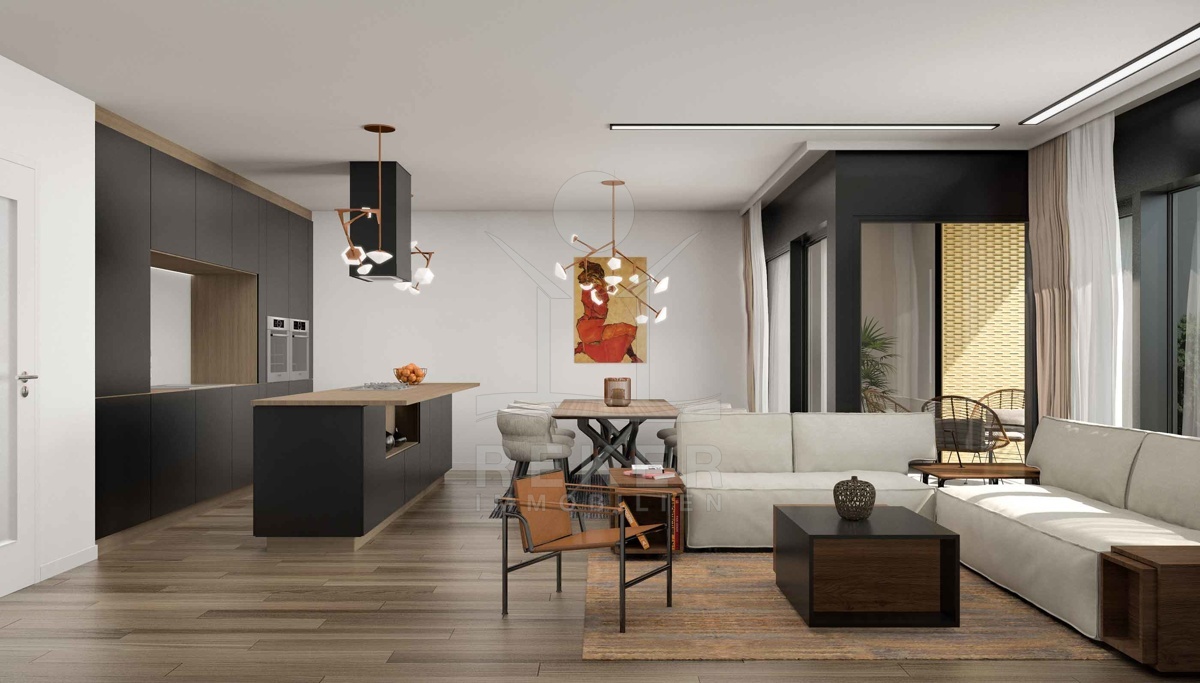 Das Apartment wird mit hochmodernen Annehmlichkeiten wie Klimaanlage, Fußbodenheizung und einer effizienten Luft/Wasser-Wärmepumpe ausgestattet sein. Der großzügige Grundriss von 134,78 m² bietet ein offenes Wohnkonzept mit integriertem Ess- und Küchenbereich, perfekt für exklusives Wohnen. Mit vier Schlafzimmern, drei Badezimmern, einem Gäste-WC und einem Hauswirtschaftsraum bietet diese Wohnung ausreichend Komfort und Platz für die ganze Familie. Die einladende Loggia lädt zu entspannten Stunden im Freien ein und erweitert den Wohnbereich nach draußen. Genießen Sie gemütliche Abende und entspannte Momente in Ihrem neuen Zuhause.