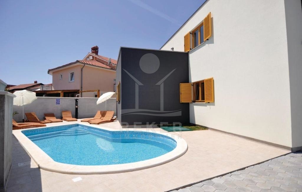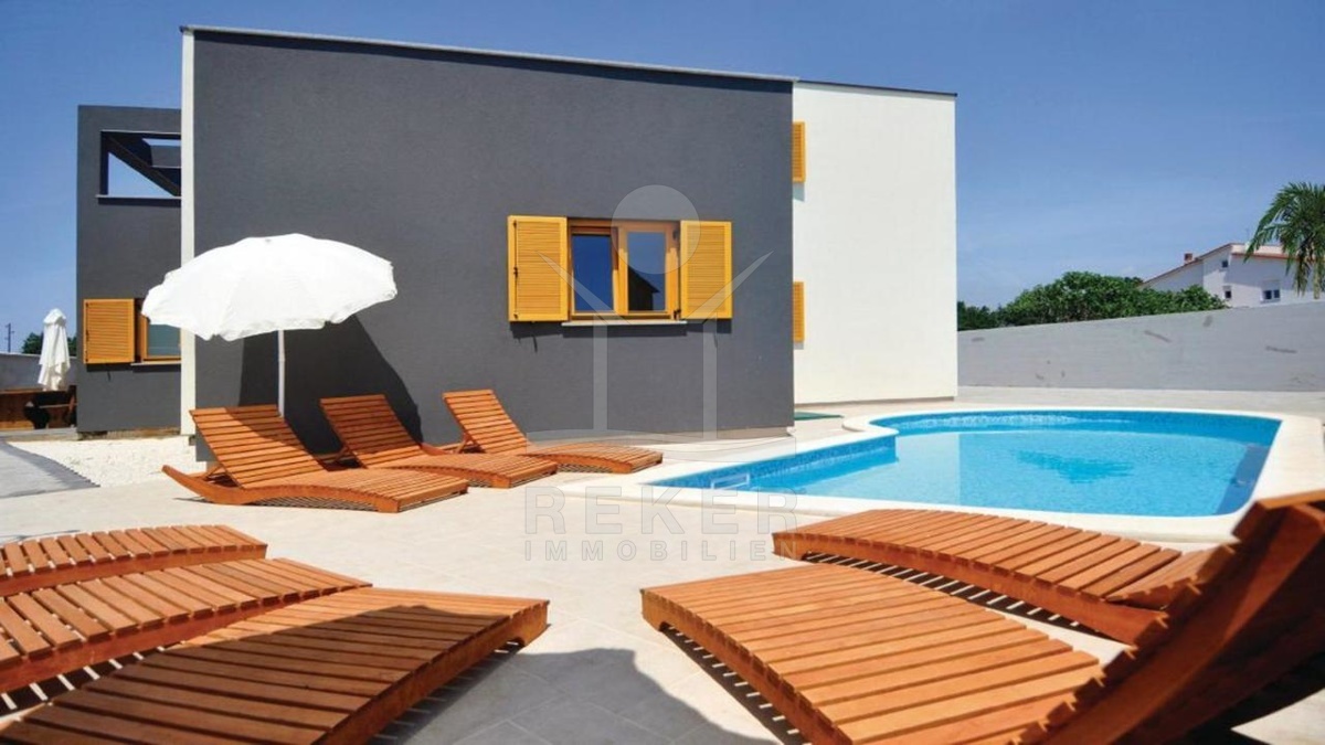 Die Außenbereiche beider Häuser sind wunderbar gestaltet und bieten den Bewohnern die Möglichkeit, das warme Wetter zu genießen. Haus Nr. 1 verfügt über einen Außenpool mit einer Fläche von 28 m² und einen Grill. Diese wunderbare Außenanlage laden zu Grillabenden und entspannten Stunden im Freien ein.